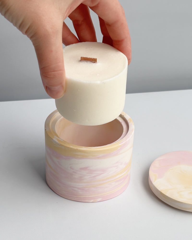 Wszystkie nasze produkty tworzymy ręcznie z wosku roślinnego, a pojemniki i dekoracje z kamienia mineralnego.